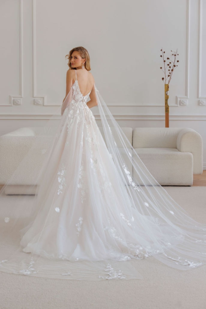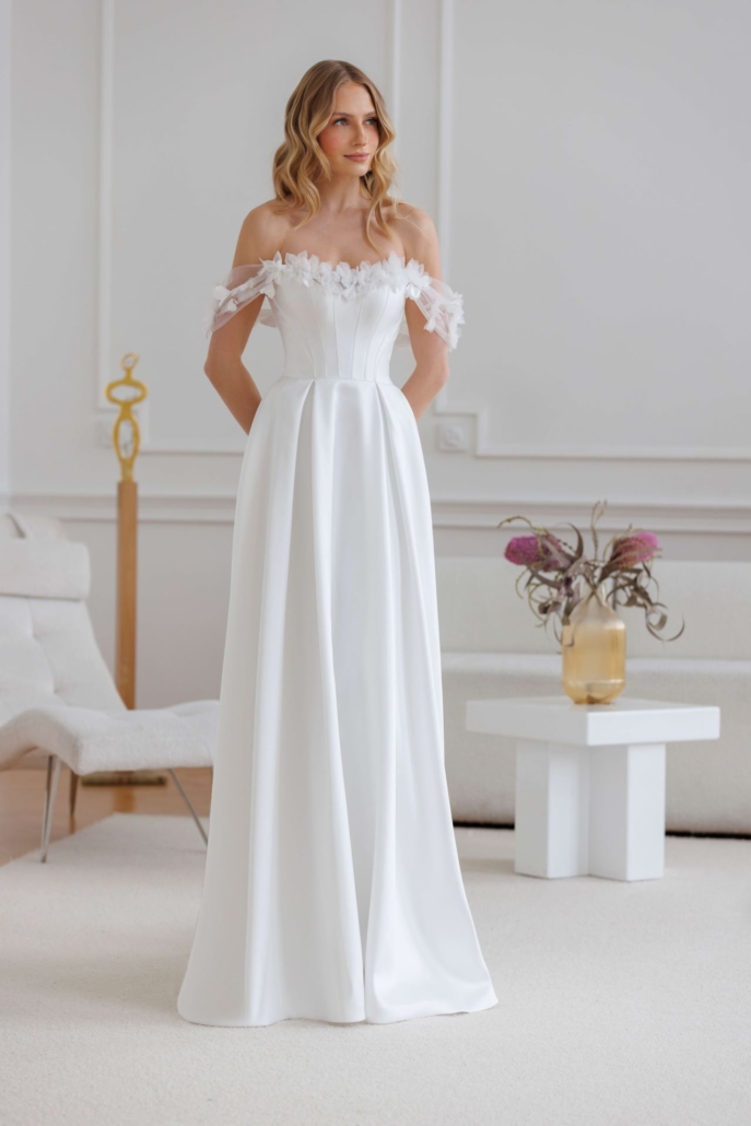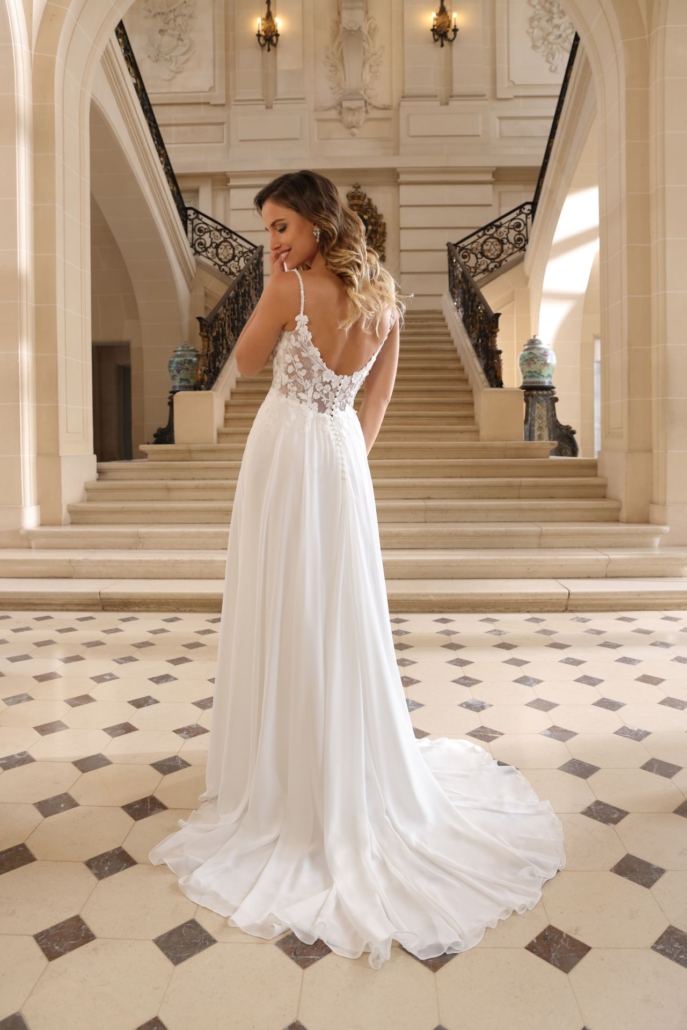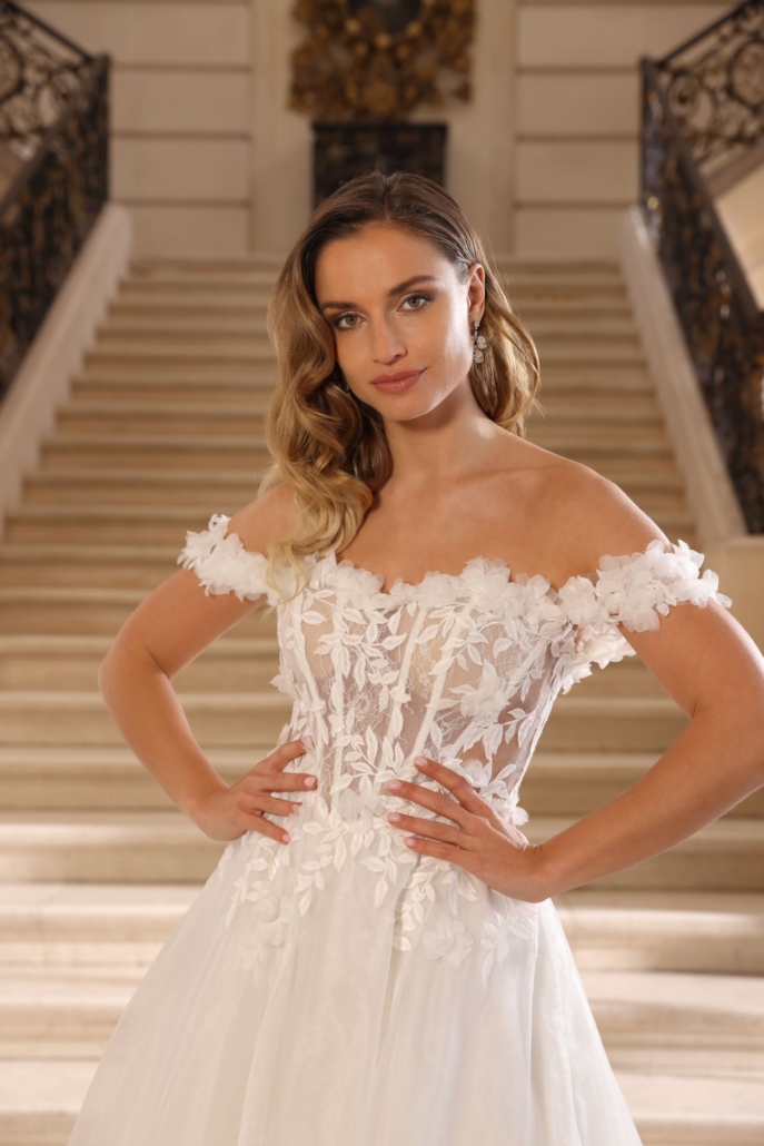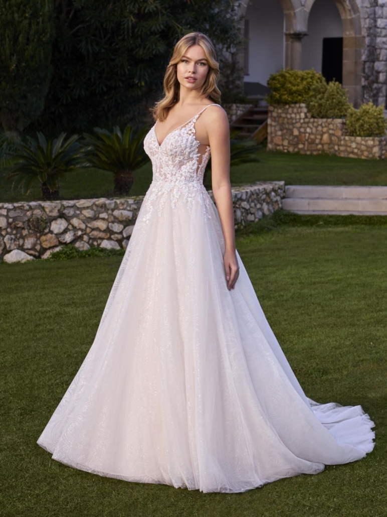 Inspiriert von der klassischen Form des Buchstabens “A” verleiht dieses Hochzeitskleid Ihrer Feier einen Hauch von Märchenromantik.